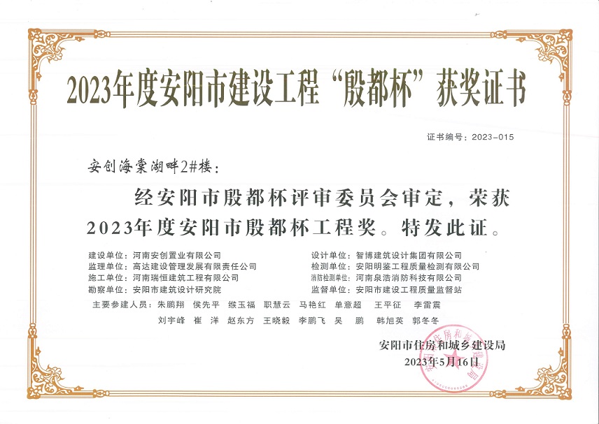 喜訊:河南瑞恒榮獲2023年度安陽市建設工程“殷都杯”榮譽證書